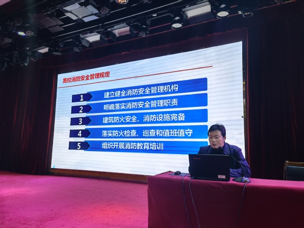 后勤保卫处处长郑立平作“高校消防安全管理规定解读”,分别从校园消防安全现状、高等学校消防安全管理规定、校园消防安全检查要点等三个方面分析了学校目前存在的安全隐患,同时针对广大师生在日常生活中对消防安全应注意事项及在日常消防检查中应遵循的法律法规进行了深入的讲解。