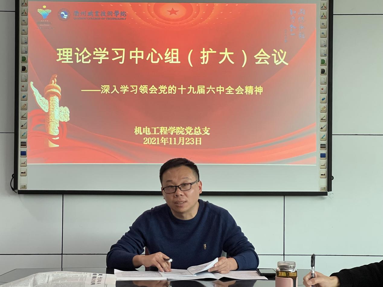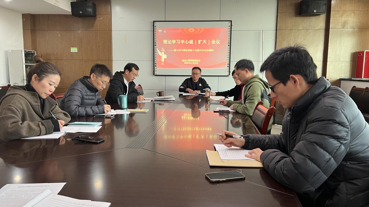 11月23日下午,机电工程学院召开理论学习中心组(扩大)会议,深入学习领会党的十九届六中全会精神。机电工程学院理论学习中心组成员参加,各党支部书记参加联学,会议由学院党总支书记朱峻主持。