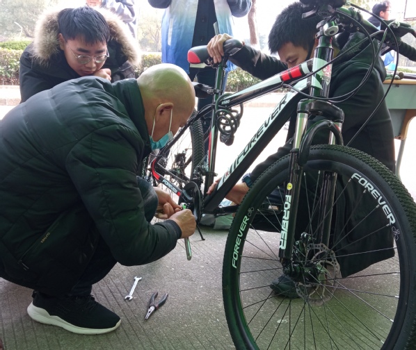 “耐心一路牵”打气活动为师生提供免费自行车补胎、打气、修理的服务。