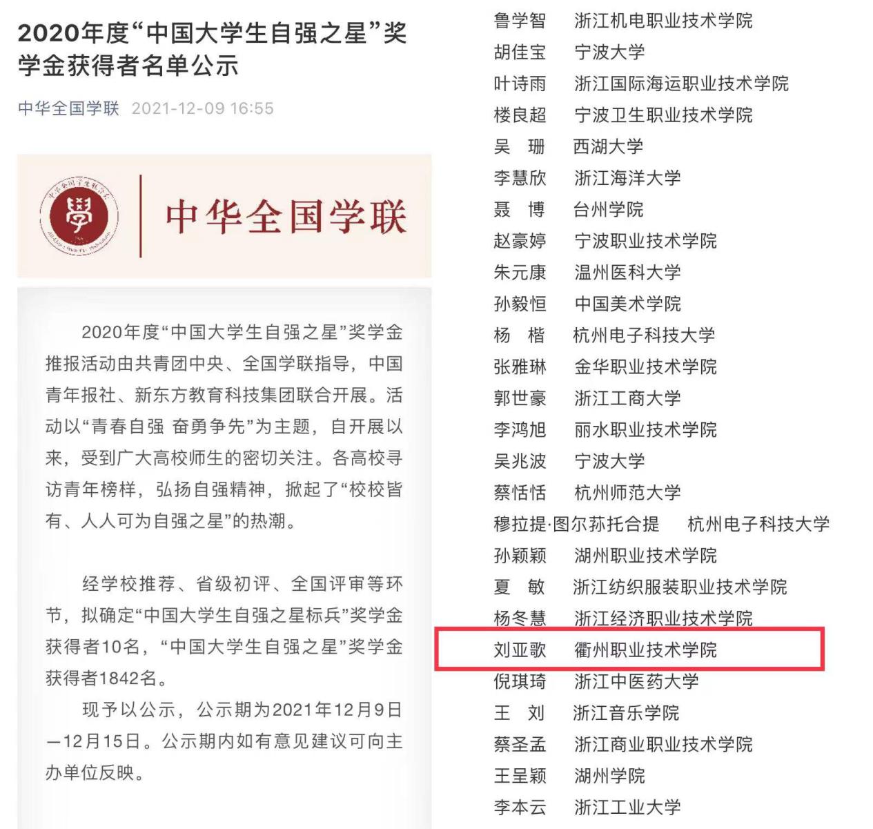 自信人生二百年,会当水击三千里。习近平总书记曾强调:“努力奋斗才能梦想成真。”我校信息工程学院青年学生刘亚歌牢记习近平总书记嘱托,把大有可为的殷切期盼转化为大有作为的生动实践,坚持梦想勇奋斗,坚定信仰永向党,被评为2020年度“中国大学生自强之星”,荣获“中国大学生自强之星”奖学金。
