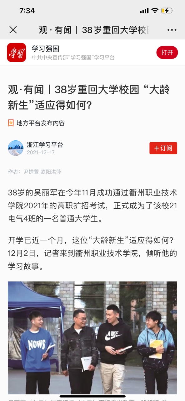 38岁的吴丽军在今年11月成功通过开元网页版2021年的高职扩招考试,正式成为了该校21电气4班的一名普通大学生。