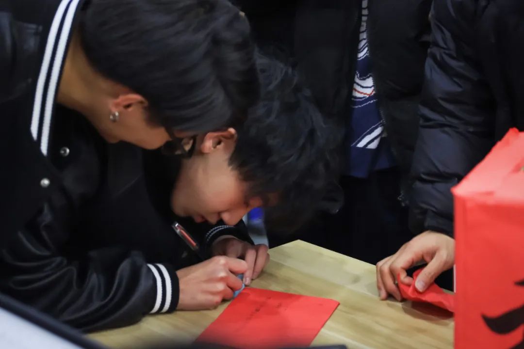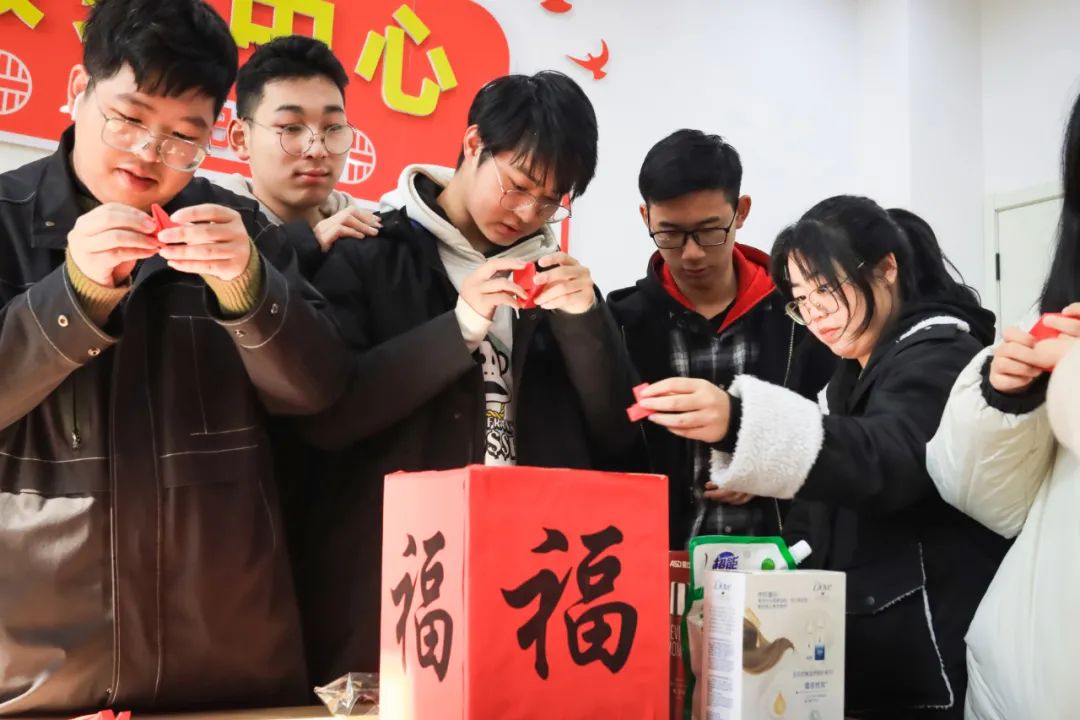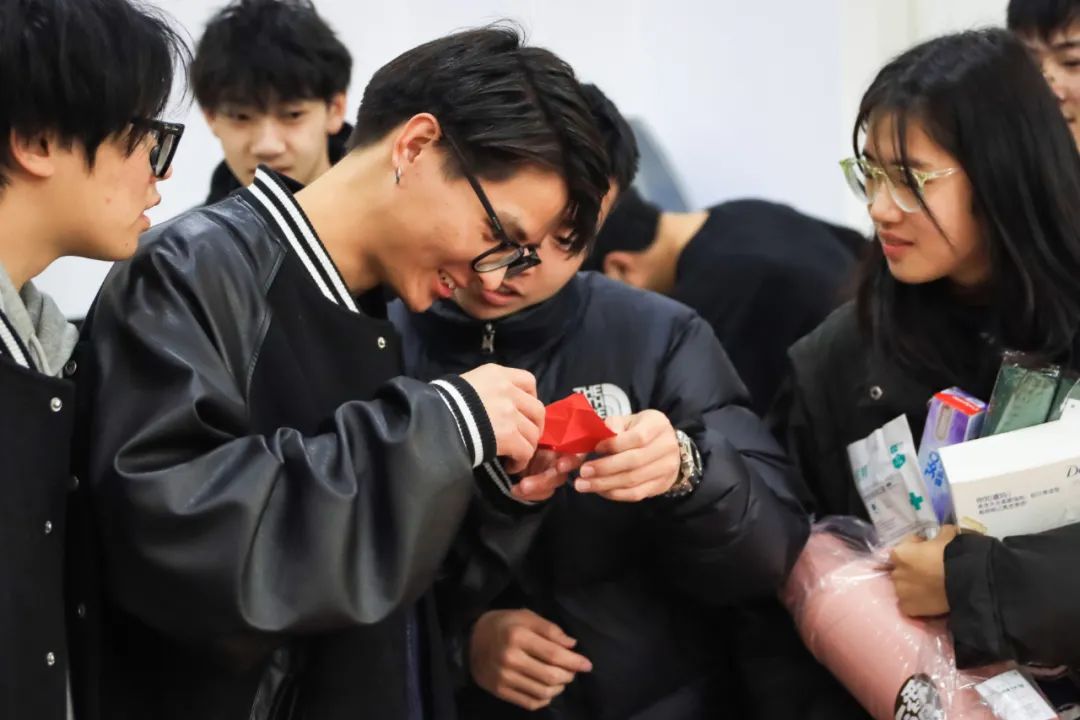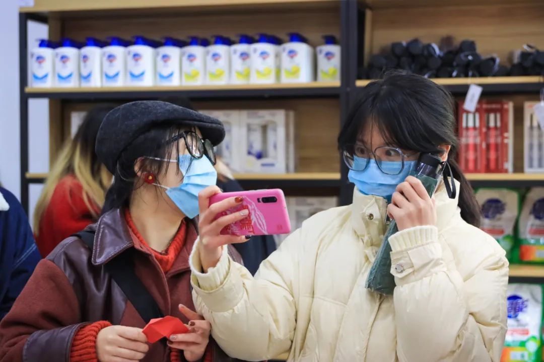 同学们在打开自己专属的“新年爱心”时,有人得到了暖心的跨年祝福,有人写下了2022年的目标和心愿,有人得到了党史、校情、风俗等知识,也有人现场打电话给自己的爸爸妈妈,对他们说:“我爱你!”开心、羞涩、紧张、激动……所有这些美好瞬间在短短的一下午时间里无数次上演,使小小的超市内气氛不断升温,点燃着在场所有人的热情,使人深刻感受“爱心”奉献后的激动人心和催人奋进。