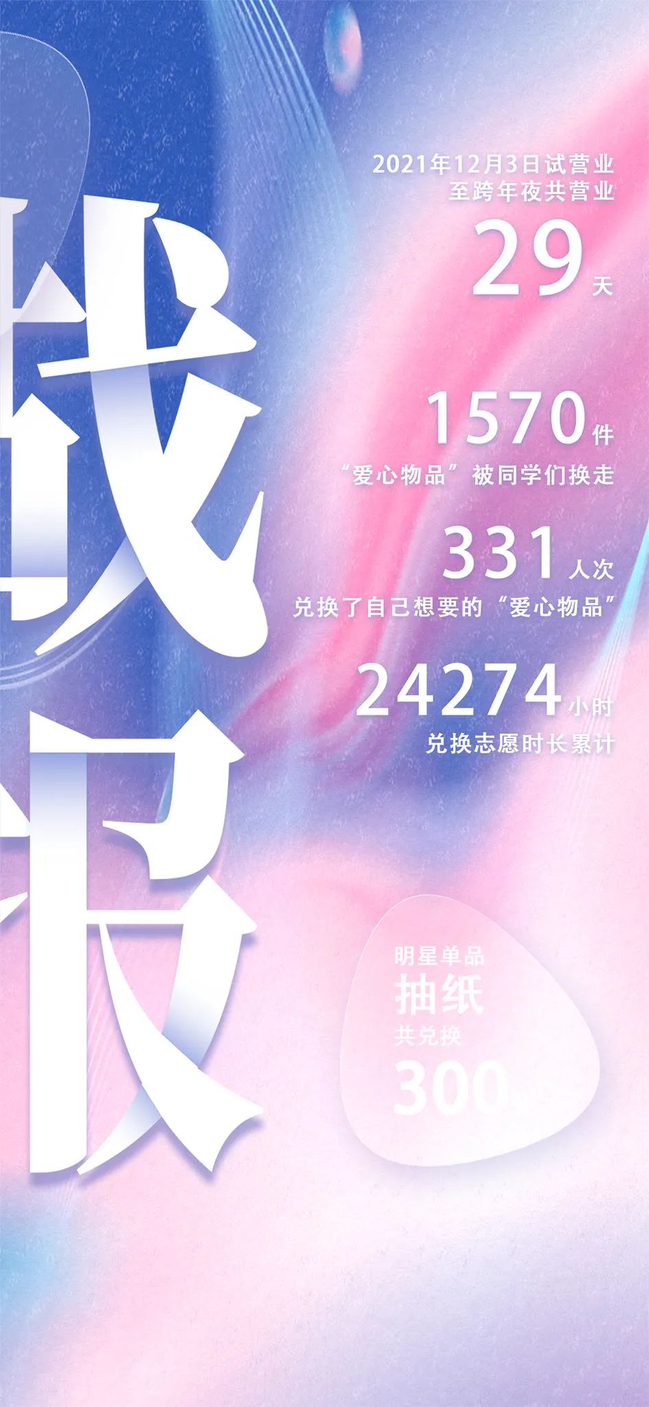在2021年的最后一天,“爱心超市”货架上的近600件物品在3个小时内,就被99位同学兑换一空,累计兑换志愿服务时长达8455小时。