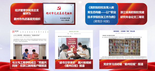 2.重视党建研究,扎实理论基础。2021年,经济管理学院党总支被评为衢州市先进基层党组织。由蒋雪芬、何昊撰写的《高职院校校友育人教育生态构建——以**职业技术学院校友工作为例》获浙江省高职院校党建研究年会论文二等奖。与义乌工商学院成立“党建共同体”在浙江新闻客户端报道。“读书日学党史”图片新闻被《衢州日报》报道。学党史活动被“衢州经视”报道。