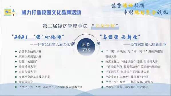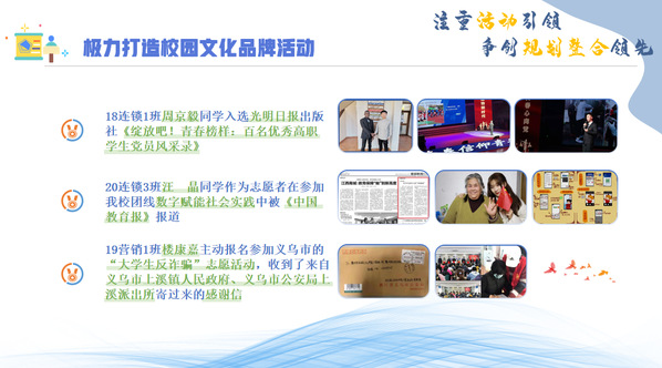 积极打造经管文化品牌活动。2021年,我院围绕第二届经济管理学院“云朵计划”,以两节文化为主导,有效组织学生参与各项素质、技能大赛,促使学生综合能力和专业内涵得到提升,促使学生活跃在校园内外的各个领域,发光发热。18连锁1班周京毅同学的励志事迹入选光明日报出版社;20连锁3班汪晶同学作为志愿者在参加数字赋能社会实践中被《中国教育报》报道;19营销1班楼康嘉主动报名参加“义乌市大学生反诈骗”志愿活动,收到了来自义乌市上溪镇人民政府的感谢信。
