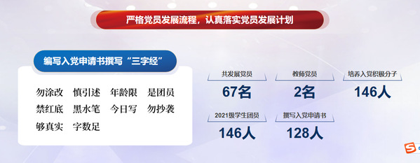 2.严格党员发展流程,认真落实党员发展计划。2021年,经济管理学院共发展党员67名,其中教师党员2名,培养入党积极分子146人。2021级学生共有团员146人,撰写入党申请书128人。积极落实学生入学第一课,开展2021级新生强国有我思政第一课。
