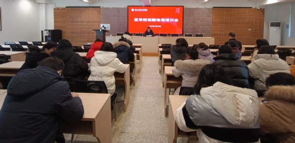 为进一步落实省市疫情防控工作的政策方针,全力协助衢州市疫情防控工作,后勤保卫处联合医学院专门组建“核酸采样储备队”,于2月23日下午在医学实训楼多功能厅开展核酸采样培训会,进行核酸采样规范化培训。会议由医学院院长姚水洪主持,后勤保卫处处长郑立平、公共卫生管理科科长胡颖菲、医学院具有医师执业资格证书和护士执业资格证书的教职工参加会议并接受培训。
