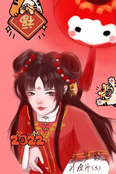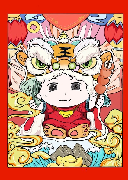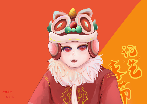 作品简介:这幅画用了很多春节元素,最终决定用红色作为主要颜色,加入具有中国风元素的老虎帽子。背景是红橙为主,这两种颜色代表了积极、向上、温暖,也代表了春节的红红火火。