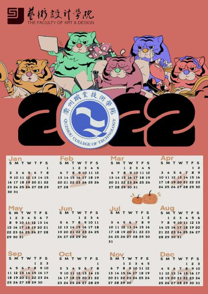 作品介绍:2022年是中国的壬寅虎年,把“0”用校标显示,左上角是学院的logo。主体以老虎为主,祝愿各位师生在新的一年里虎虎生威。下方为2022年年历和橙子,寓意大家能够把握好新年的每一天,过得充实,心想事成。