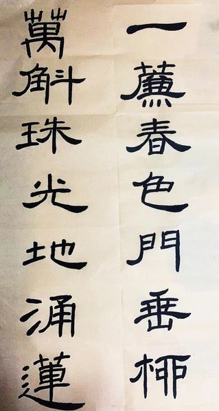 作品简介:“一帘春色门垂柳,万斛珠光地涌莲。”意思是门前的垂柳像绿色的帘幕,一片春色;群灯闪耀,地下涌出来的莲花灯散发珍珠般的光芒。上下联含义相呼应,上联描绘出元宵节初春时节,垂柳依依的美景,下联刻画出元宵之夜的张灯结彩,莲花灯熠熠生辉的人文景观。自然景观与人文景观融为一体,烘托出节日喜庆祥和的氛围,像一幅美好和谐的风景画,品之让人心旷神怡。