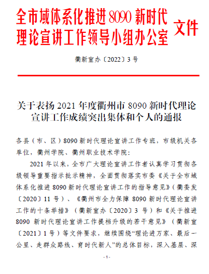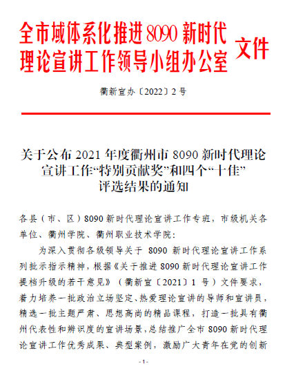 我校荣获2021年度衢州市8090新时代理论宣讲工作“成绩突出集体”荣誉。
