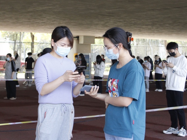 学生们正在有条不紊地进行核酸检测。