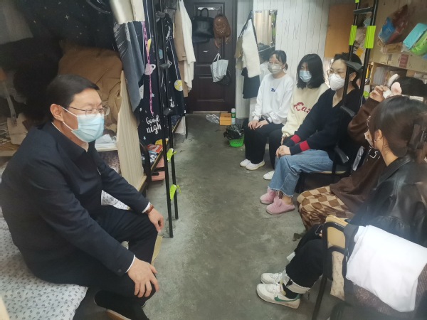 校党委书记徐须实检查校园物资供应、校园防疫措施落实情况;实地走访校园核酸检测现场;深入联系寝室,了解学生思想动态,关心关怀学生的学习和生活情况。