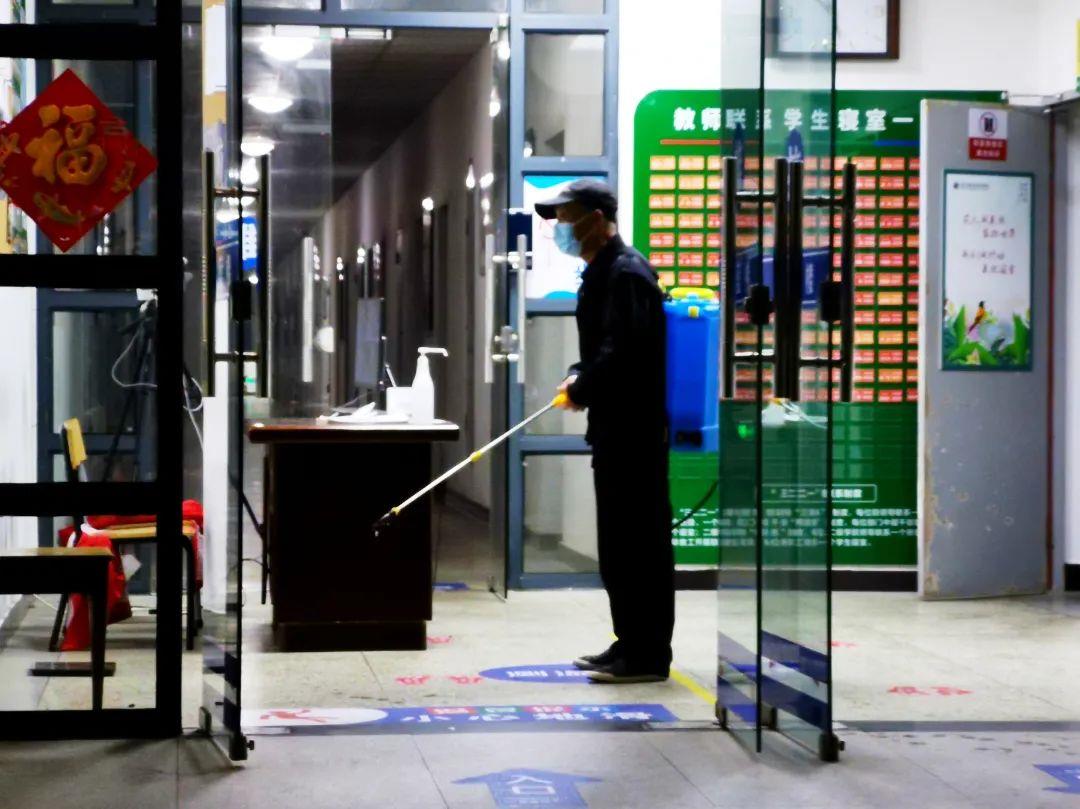 凌晨两点,物业人员在寝室楼进行环境消毒。