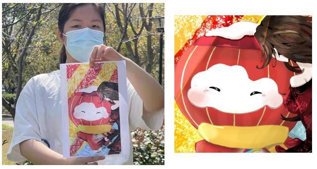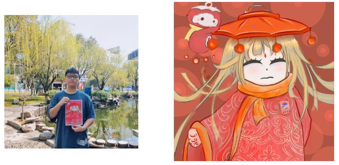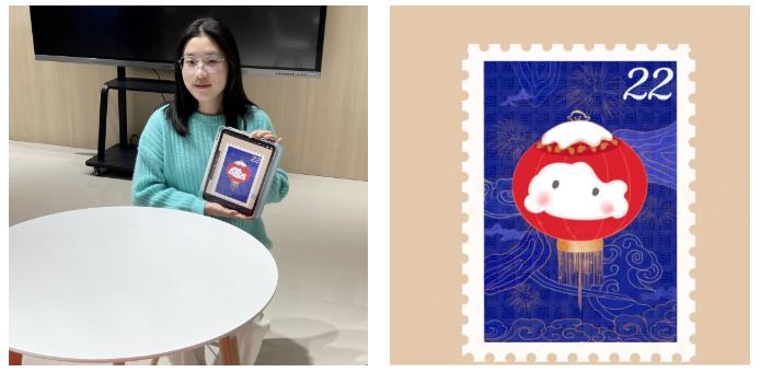 作品介绍:《融》以邮票为主题,把雪容融还原回灯笼的形状,代表着收获、喜庆、温暖和光明。背景由艺术设计学院的院徽拼接而成,加上祥云、烟火等中国元素的点缀,传达出设计学院“多彩艺术,精彩无限”的精神。