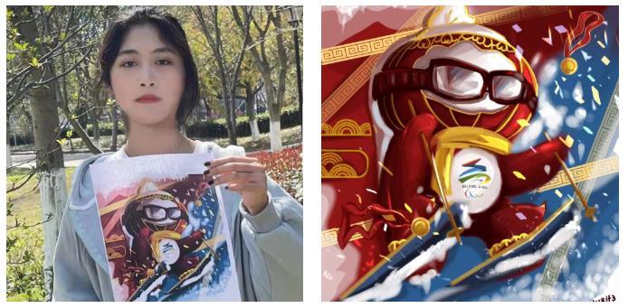 作品介绍:《雪容融·框出未来》配色以红蓝为主,红色代表热血积极,蓝色代表青春活力,背景加入了祥云、飞雪以及金牌,展现运动员们即使身有缺陷,却依旧勇敢追梦的精神。