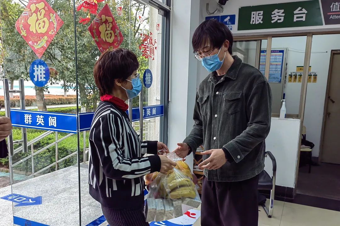 寝室解封后,方焕云为同学们递上医用口罩。提醒大家疫情未散,仍要戴好口罩,做好防护。