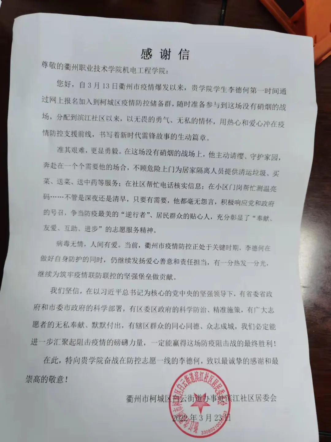 近日,我校机电工程学院收到了一封感谢信,感谢自 3 月 13 日衢州市疫情爆发以来,机电工程学院学生李德何第一时间通过网上报名加入到柯城区疫情防控储备群,随时准备参与到这场没有硝烟的战场。自从来到滨江社区,李德何同学以无畏的勇气、无私的情怀,用热心和爱心冲在疫情防控支援前线,书写着新时代雷锋故事的生动篇章。