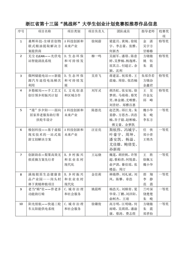 浙江省第十三届“挑战杯”大学生创业计划竞赛拟推荐作品公示