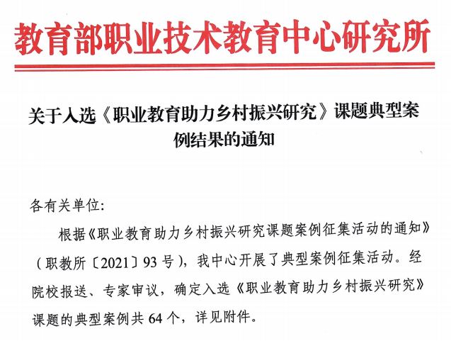 根据教育部职业技术教育中心研究所发布的《关于入选“职业教育助力乡村振兴”课题典型案例结果的通知》,我校《开元网页版打造“乡村振兴综合体”全力助推乡村共同富裕示范区建设的探索与实践》入选课题典型案例。