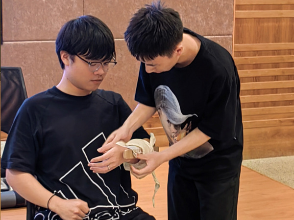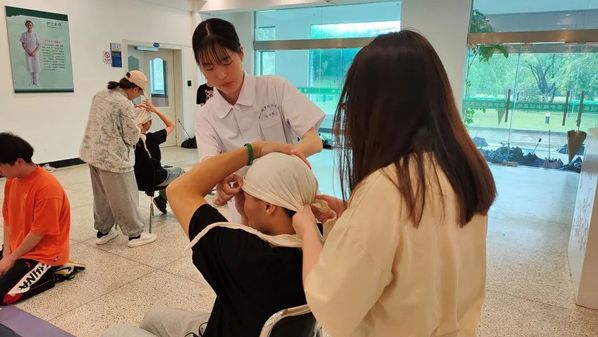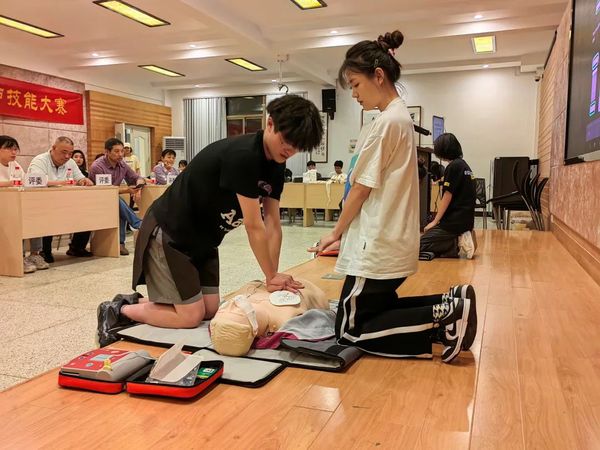 12支队伍经抽签后分别进行三个竞赛项目的比赛:头部出血三角巾包扎5min、前臂闭合性骨折固定5min、双人配合现场心肺复苏(CPR+AED)6min。竞赛中,参赛的选手们沉着冷静、有条不紊、操作娴熟,表现出了较高的技能操作水平。他们评估周围环境、合理摆放病人体位、胸外心脏按压、开放气道......每个动作都规范到位,充分展示了大学生精湛的心肺复苏等救护技能。
