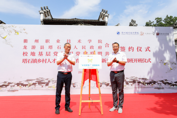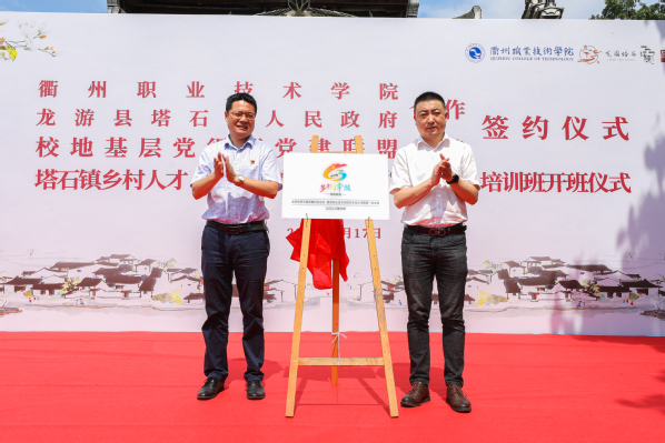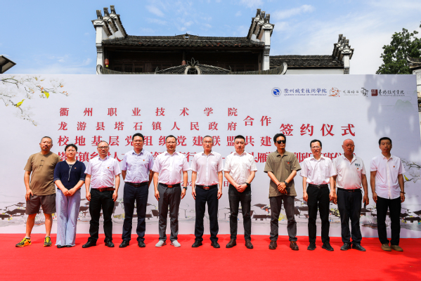 为深入贯彻落实省、市“红色根脉强基工程”,扎实推进基层党建十大专项计划,发挥艺术设计学院专业特色优势,拓展校地深度合作,推动党建品牌创建培育,6月17日上午,我校与龙游县塔石镇人民政府在塔石镇泽随村举行合作暨校地基层党组织党建联盟共建签约仪式。校党委委员、副校长何百通,龙游县委组织部副部长、两新工委书记刘俊,艺术设计学院院长叶云龙、党总支书记戚景云,继续教育学院院长徐荆、副院长周华,塔石镇党委书记张斌等出席仪式,艺术设计学院党政领导班子成员,师生代表参加仪式。