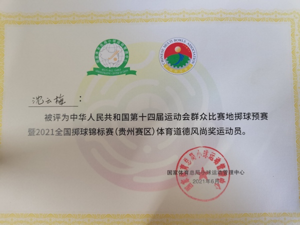 2021年6月,中华人民共和国第十四届运动会群众比赛地掷球预赛在贵州举行,沈云梅同学与其他队员一起跟随教练备赛。比赛前,紧张不安慢慢涌上她的心头,她的队伍面对的不仅仅是青年队伍,更有成人队伍,他们当中有些运动员已有国家集训的经验,更不乏曾经的全国冠军和世界冠军。她说:“其实比赛开始之前,自己一夜未眠。”在队友和老师的鼓励下,她最终克服了心里压力,调整状态,与搭档配合默契,获得了大金属球双人连续抛击的第三名。在比赛期间,她也与其他队伍的运动员有着良好的技术交流,保持良好的赛风赛纪和文明礼仪,展示了良好的形象和风度,最终荣获“体育道德风尚奖”。