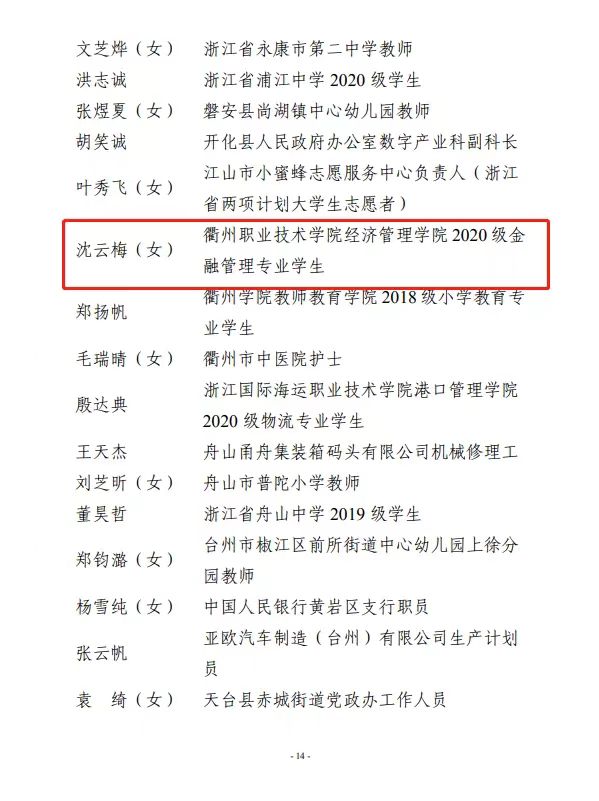 为表彰先进、树立典型,激励各级团组织和广大团员、团干部向先进学习、向优秀看齐,近日,共青团浙江省委表彰了2022年浙江省五四红旗团委(团支部)、优秀共青团员、优秀共青团干部。我校地掷球社团成员、经济管理学院20金融管理2班沈云梅同学荣获“浙江省优秀共青团员”称号。