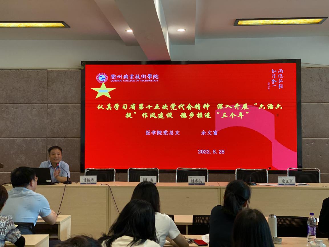 8月28日下午,医学院召开全体党员大会,非党员教师列席,党总支书记余文富以“认真学习省第十五次党代会精神,深入开展“六治六提”作风建设,稳步推进“三个年””为题,在全体教职工中开展新学期“党建思政”第一课。