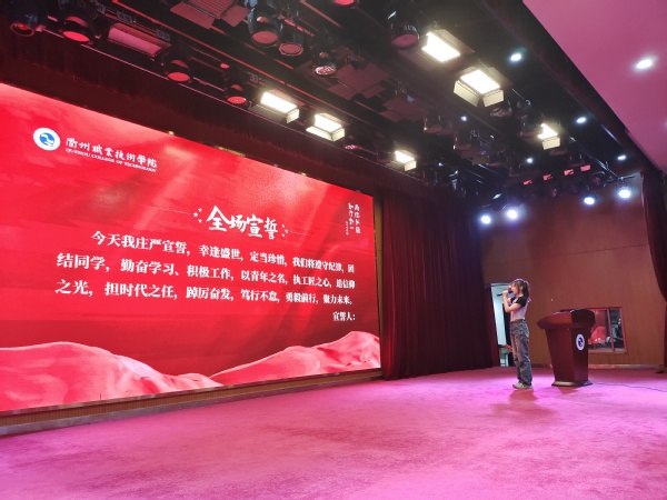 “今天我庄严宣誓,幸逢盛世,定当珍惜,我们将遵守纪律,团结同学,勤奋学习、积极工作,以青年之名,执工匠之心,追信仰之光,担时代之任,踔厉奋发,笃行不怠,勇毅前行,聚力未来”。