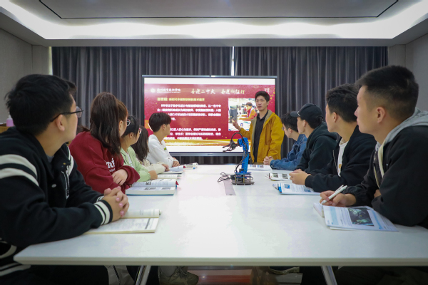 10月18日,开元网页版信息工程学院教师高野在课堂上向学生传达习近平总书记关于科教兴国,人才强国相关的重要论述,还与大家分享身边的技术能手事迹。(本报通讯员 欧阳洪萍 摄)