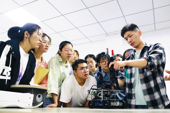 “科技是第一生产力,人才是第一资源,创新是第一动力。”衢职院信息工程学院教师、全国技术能手高野用创新团队老师们研发的柔性采摘水果机器人为这句话做了最好的注脚。“101”关注团的同学们围在一起,仔细聆听了创新团队老师们如何通过机器学习、图像识别、智能传感器等技术的融合,实现柔性采摘水果机器人对周围环境的精确感知,“科技的变革解放和取代了相当一部分的人工劳动力,大幅提高农业作业水平、作业效率,促进农民增收、农业高质量发展,加快实现强民富民的构想。”高野说。科学知识通过技术成果作用于生产力,如今已经完成了工厂从手工业向机器大工业过渡的阶段,即以机器取代人力,以大规模工厂化生产取代个体手工生产。高野老师希望以此敦促同学们要扎实基础知识,增强技术技能,“当生产者的素质、劳动工具跟不上科技水平的发展时,这两者都将面临淘汰的风险。”