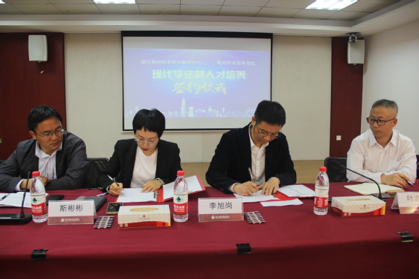 为认真贯彻《教育部办公厅关于全面推进现代学徒制工作的通知》精神,主动服务地方经济社会发展,推动现代商贸服务职业教育体系和劳动就业体系互动发展。10月31日,经济管理学院与浙江稠州商业银行股份有限公司衢州分行举行“现代学徒制人才培养签约仪式”。经济管理学院党总支书记斯彬彬、副院长覃龙飞、稠州银行衢州分行行长李旭岗、总行培训管理中心经理叶志亮,以及2023届现代学徒制稠州班全体学员共30余人参加了仪式。