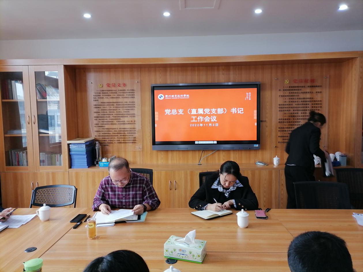 会上徐有强作了《聚焦党的二十大》--党的二十大精神学习交流,并结合党中央、浙江省委及校党委的工作要求,对各基层党组织下一步的学习宣传贯彻党的二十大提出了工作要求。同时,还组织大家学习了省委组织部副部长曹锦喜在高校调研座谈会上的讲话精神。组织部组织科长程强布置了执行党的组织生活制度情况检查、党员干部思想状况分析及省级、校级“双创”工作考评等相关工作。