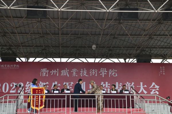 徐须实讲话。他指出,衢职院20年的办学积淀,构筑了与全校师生一起奋进新时代的坚实基础,新生们的传承与接力,为衢职院永葆青春活力注入了新鲜血液。徐须实寄语全体新生,要坚定理想信念,争做新时代“精神富人”。认真学习宣传党的二十大精神,发扬伟大的建党精神,将个人理想追求与党和国家事业相连,把个人前途命运与民族复兴大业相系,不负韶华、不负时代,在青春的赛道上跑出当代青年的最好成绩。要锤炼扎实本领,争做新时代“工匠达人”。认真学习专业技能,在理论学习之余,积极参与实习实训,投身社会实践“大熔炉”,走进一线“大课堂”,把“读万卷书”与“行万里路”结合起来,在“知行合一”中练就过硬本领,在实践中经风雨、见世面、长才干。要练就健康体魄,争做新时代“蓬勃青年”。巩固和发扬军训中养成的良好习惯,把锻炼身体作为一种爱好、一种习惯、一种生活方式,让强健的体魄和饱满的精气神成为青春远航的不竭能源。军训,是磨练意志的沙场,更是铸就团结的基地。相信通过军训,衢职新生们一定会怀抱梦想又脚踏实地,敢想敢为又善作善成,做有理想、敢担当、能吃苦、肯奋斗的新时代好青年,让青春在全面建设社会主义现代化国家的火热实践中绽放绚丽之花。