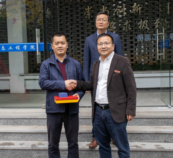 接着,信息工程学院院长马文龙向柴云红赠送20周年纪念品,吕延文和柴云红共同为景观石揭幕。