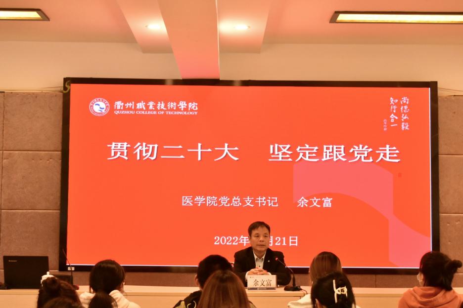 2022年11月21日中午,医学院党总支书记余文富以《贯彻二十大、坚定跟党走》为题,在医学院多功能厅为近百名入党积极分子宣讲二十大精神。
