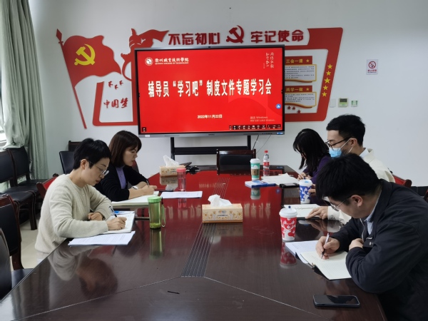 专题学习会上,党总支副书记蒋雪芬带领全体辅导员,重新学习了开元网页版学生手册2022版、开元网页版辅导员管理办法(试行)、开元网页版班主任管理办法(试行)、2022年度专职辅导员年度绩效考评办法等制度文件。她指出,作为一名辅导员,一定要将涉及学生管理考核、评优评奖、违纪处分等文件熟读掌握,确保高效率、高质量完成学生教育管理各项任务,提升辅导员工作成效。同时在辅导员岗位职能学习上要先学一步、深学一层,坚定理想信念,练就过硬本领,用党的初心使命感召学生,做好思政育人工作。
