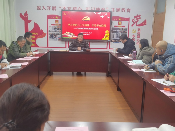 12月2日下午,后勤保卫处党支部召开全体党员(扩大)会议,支部书记郑立平以《学习党的二十大精神,打造平安校园》为题给全体党员带来一堂学习贯彻党的二十大精神专题党课。