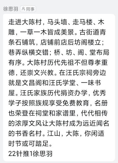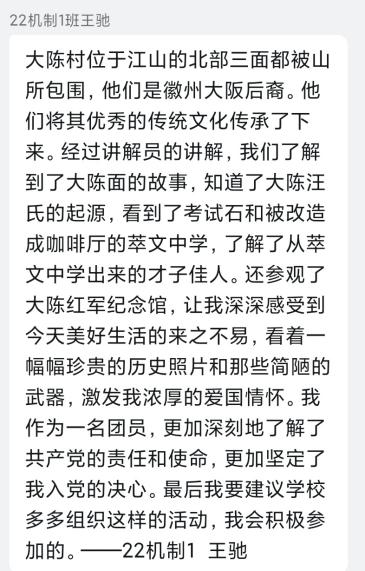 在讲解员的热情引导和耐心讲解下,同学们认真参观了汪氏宗祠、萃文中学、红军纪念馆,感受到了大陈村极具特色与活力的文化底蕴。参观过程中,同学们纷纷感慨“大陈见面”的动人故事,赞扬大陈村经商的魄力和办学的情怀、敬佩在大陈村发生的英勇抗战事迹,表示如今大陈村通过创新沉浸式村歌剧、发展乡村旅游产业等途径强村富民,以文化赋能共同富裕的模式值得深入学习。