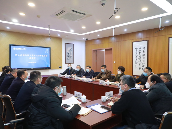 12月15日上午,市人力社保局党委书记、局长徐惠文一行来校调研。校党委书记徐须实,党委副书记、校长吕延文,党委副书记何百通,党委委员、副校长徐浪静、姚水洪陪同。