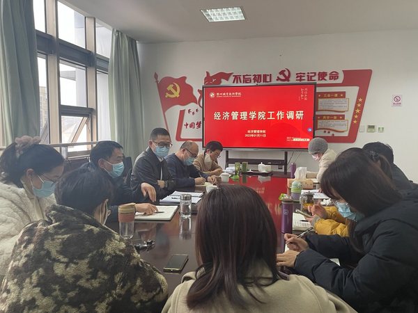 1月11日下午,校党委委员、副校长姚水洪到经济管理学院调研,教务处处长王建陪同。经济管理学院班子成员、各专业负责人参与座谈会。