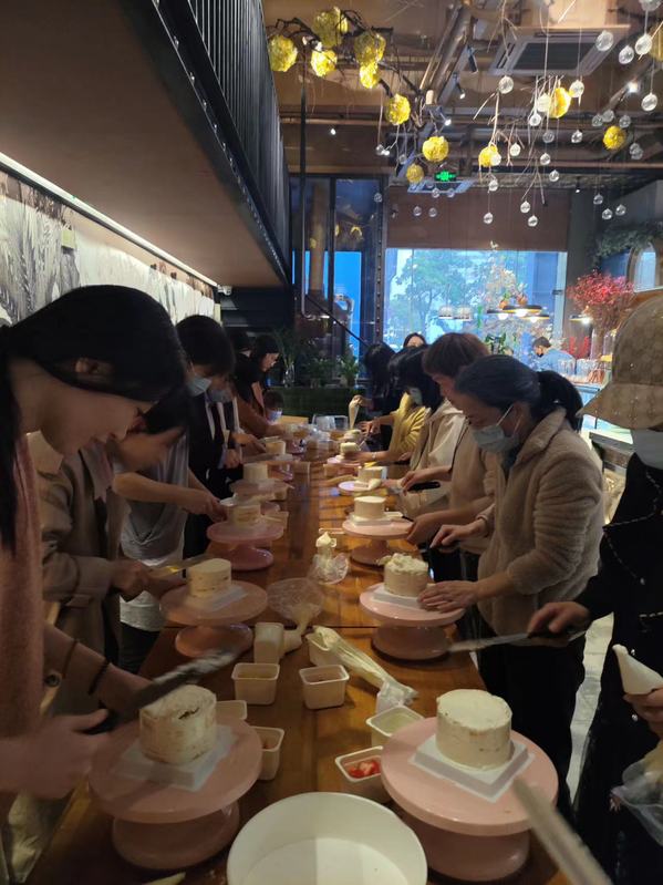 烘焙老师为大家讲解蛋糕制作的注意事项、材料配比以及制作技巧。之后,女职工们开始自己动手操作,现场气氛其乐融融。在烘焙老师的指导下,精美的蛋糕制作完成。