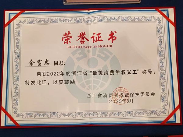2023年3月15日上午,浙江省人民政府举办了“3·15国际消费者权益日”主题活动。我校机电工程学院余富忠老师作为义工代表载誉而归,获评2022年度浙江省“最美消费维权义工”荣誉。