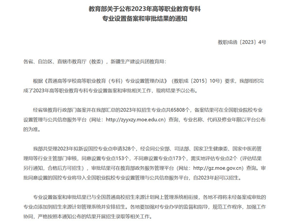 近日,教育部下发《关于公布2023年高等职业教育专科专业设置备案和审批结果的通知》(教职成函〔2023〕4号),我校申报增设的中医学专业,经专家评议和实地评估,并经国家卫健委、国家中医药管理局等行业主管部门审核,教育部审批同意增设,2023年开始面向普高类招生。