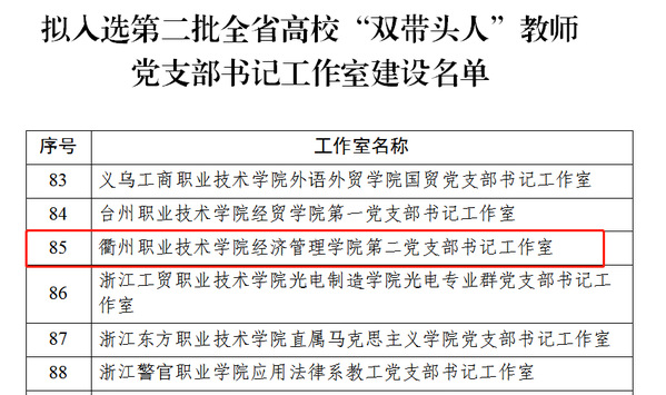 近日,浙江省教育厅公布第二批高校“双带头人”教师党支部书记工作室评审结果,我校经济管理学院第二党支部书记工作室成功入选。