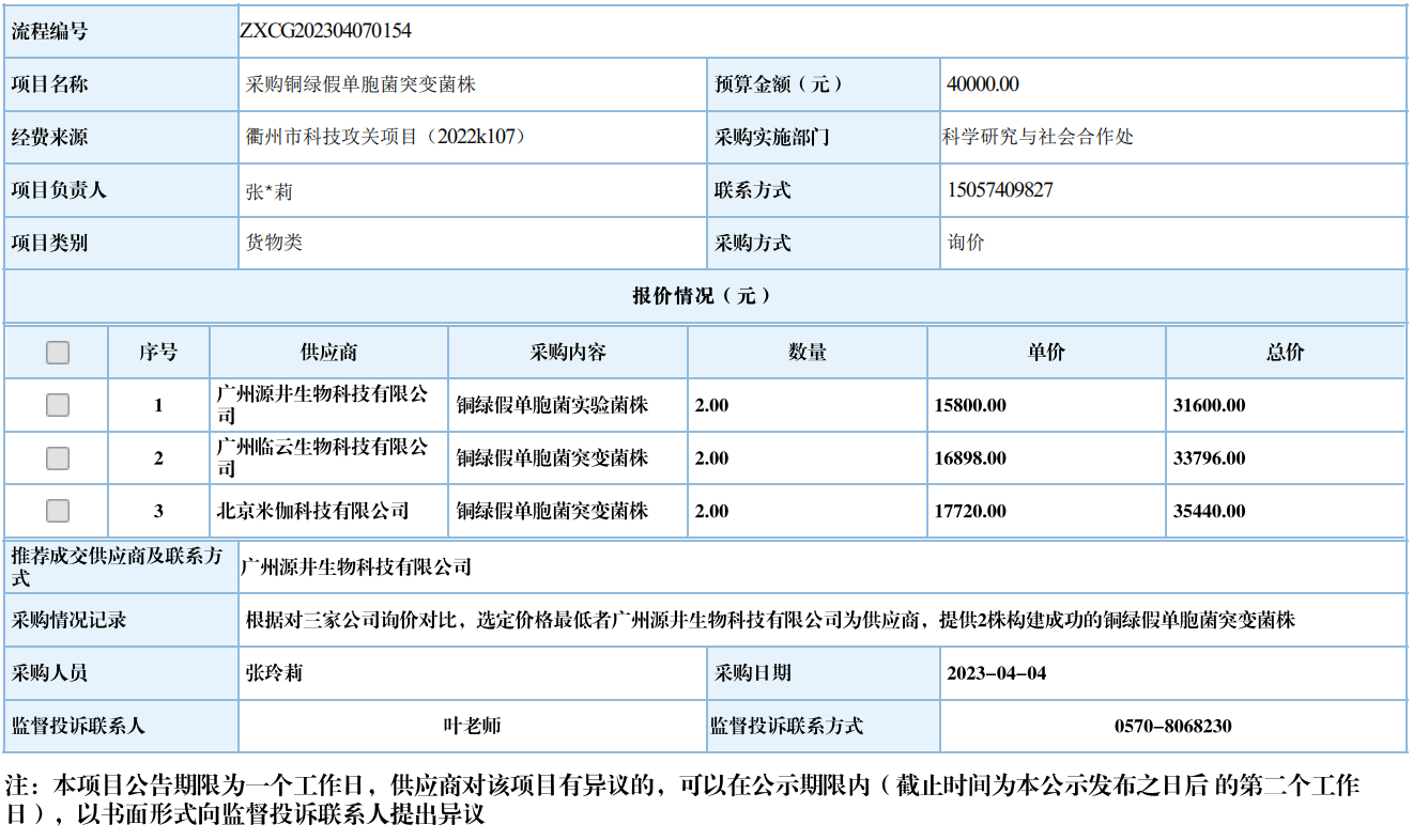开元网页版铜绿假单胞菌实验菌株自行采购信息公示