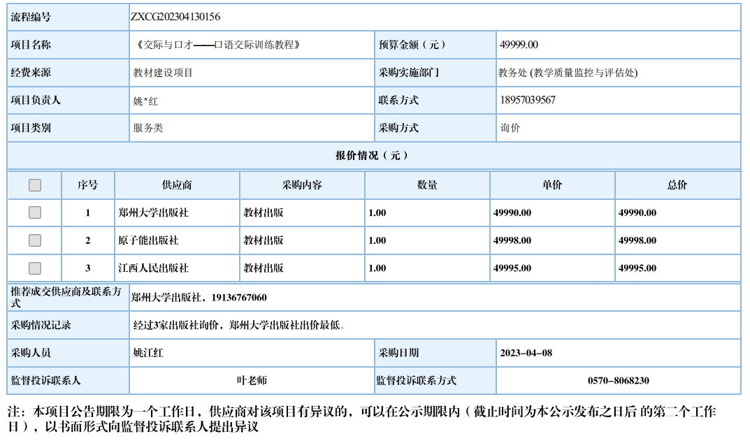 开元网页版《交际与口才-口语交际训练教程》自行采购信息公示