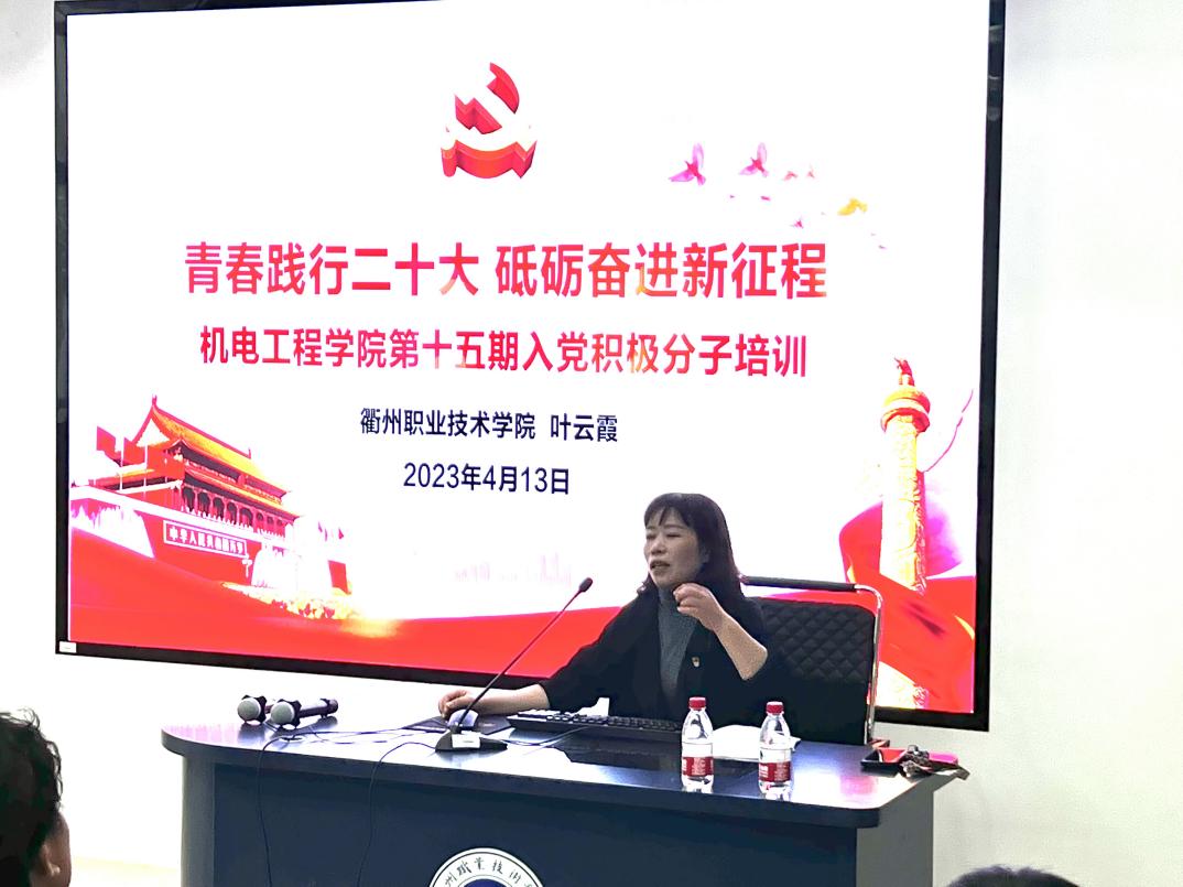机电工程学院党总支副书记叶云霞以“青春践行二十大,砥砺奋进新征程”主题,通过解读党的二十大精神、新时代青年的使命与责任、当代大学生如何践行党的二十大精神三部分内容为入党积极分子上了一堂党课。她强调,入党积极分子要笃信,守牢初心、坚守信仰;要勤学,静心钻研、求得真知;要奋斗,筚路蓝缕、砥砺前行,勇敢地担当起历史使命和重任。