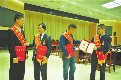 余富忠(左二)与毕少平(左一)师徒同时荣获“衢州市劳动模范”称号